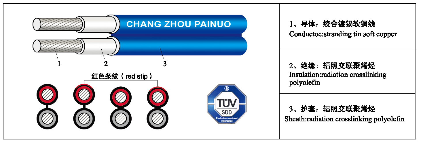 印字 MARKING PV1-F 2*()mm2 CHANG ZHOU PAINUO ELECTRON CO.,LTD. TÜV SÜD approved VDE-AR-E 2283-4:2011-10 |